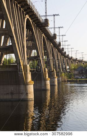 Our Stock Photographer #307582996 was taggins this picture as Dnepr Dnieper Dnipro Dnipropetrovsk Merefa-Kherson Ukraine across ancient arch arched architectural bridge bridgework city close close-up concret concrete construction crossing engineer engineering hight industrial industry infrastructure monolithic monument old pier pillar railway reinforced steel structure technology transport ukrainian view water
