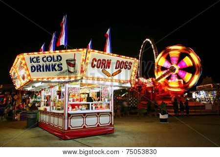 Our Stock Photographer #75053830 was taggins this picture as advertise advertisement amuse amusement amusement park booth bright candy carnival carnival rides cart colorful concessions corn county county fair dark darkness dog dog food enjoy entertainment event excitement exciting fair fairground food fried fun funfair games junk junk food junkfood lights marquee midway neon night nostalgic park refreshment retail rides sign snacks spin stand stand out state summer summertime treats vacation vendor